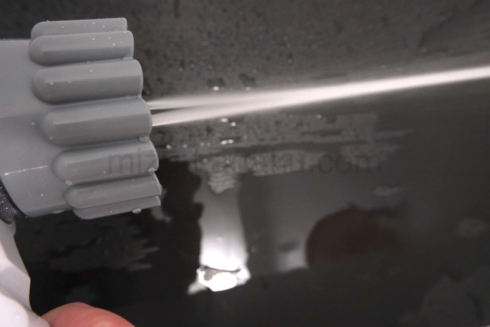 上の写真は、ミラブルZEROで一番水圧が高いと感じられる「リングストレート」モード使用中の写真です。それなりに強そうな水流ができていると思います。また、ただの水柱にしか見えませんが、その水柱一つ一つに回転が加えられ内部にも6000 万個/ccの密度でウルトラファインバブルが含まれているモードになります。
