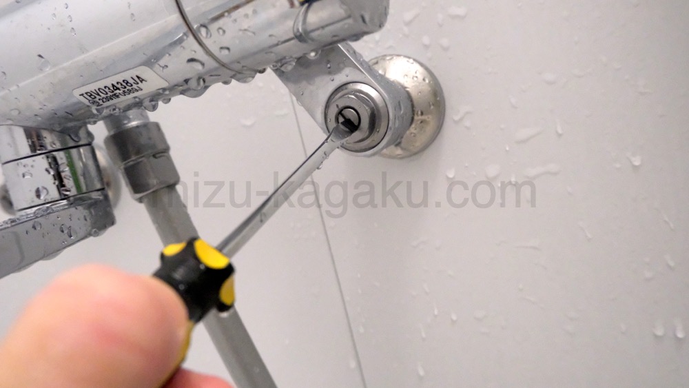 次に冷水側を調整しました。これも反時計回り(左側)に回すと、流路が大きくなり水が出やすくなります。