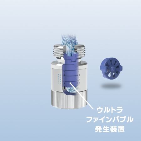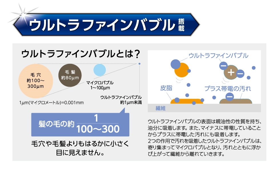 ウルトラファインバブル発生機を通過した水の中に無数に存在すること、その泡の大きさに対して、表面積が大きいため、洗剤成分と衣類や洗濯槽にかなり多くの接触機会ができると考えられます。